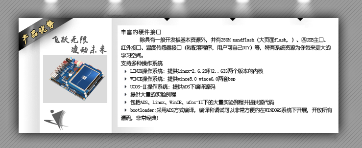 - 提供包括ADS、Linux、WinCE、uCos-II下的大量實(shí)驗(yàn)例程并提供源代碼